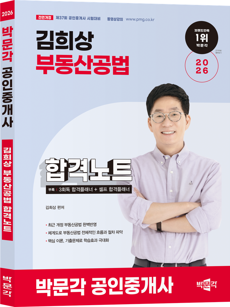 '2026 박문각 공인중개사 김희상 필수서 2차 부동산공법'은 제37회 공인중개사 시험을 대비하기 위한 필수서입니다. 부동산공법의 방대한 분량에 대한 고민을 돕고자 중요한 핵심적인 논점과 포인트를 잡아 집필하였습니다. 또한 부동산공법 핵심 논점 40제를 부록으로 첨부하여 가볍게 들고 다니며 언제 어디서나 부동산공법 학습이 가능하도록 하였습니다.